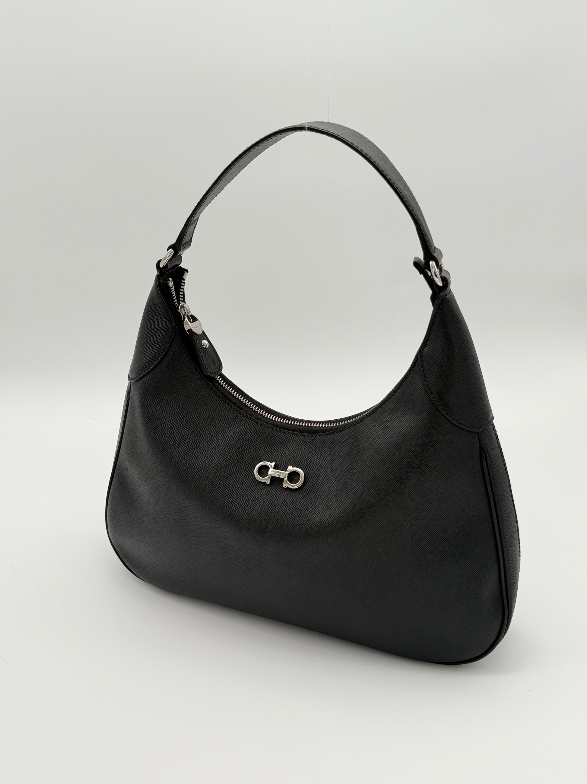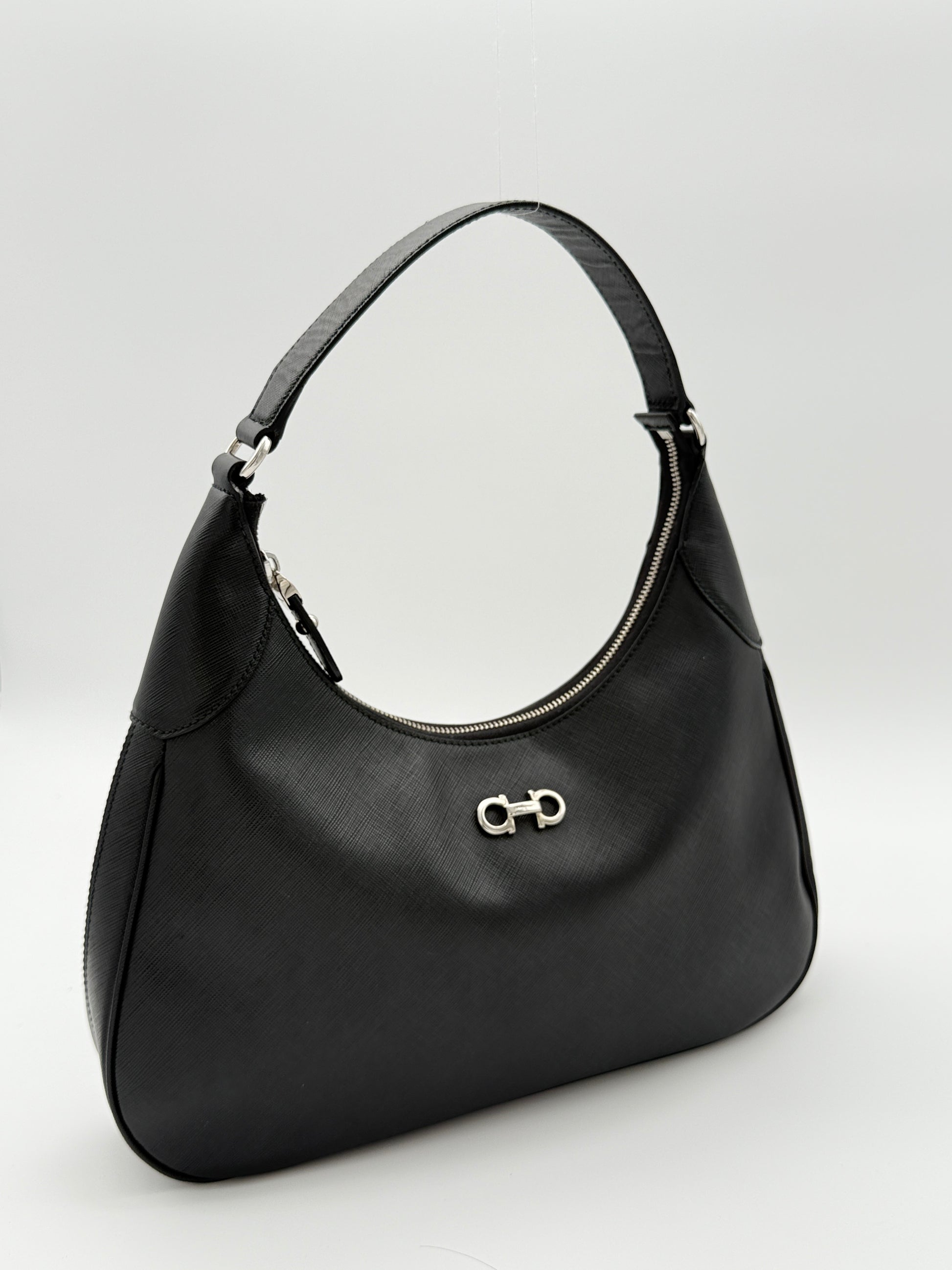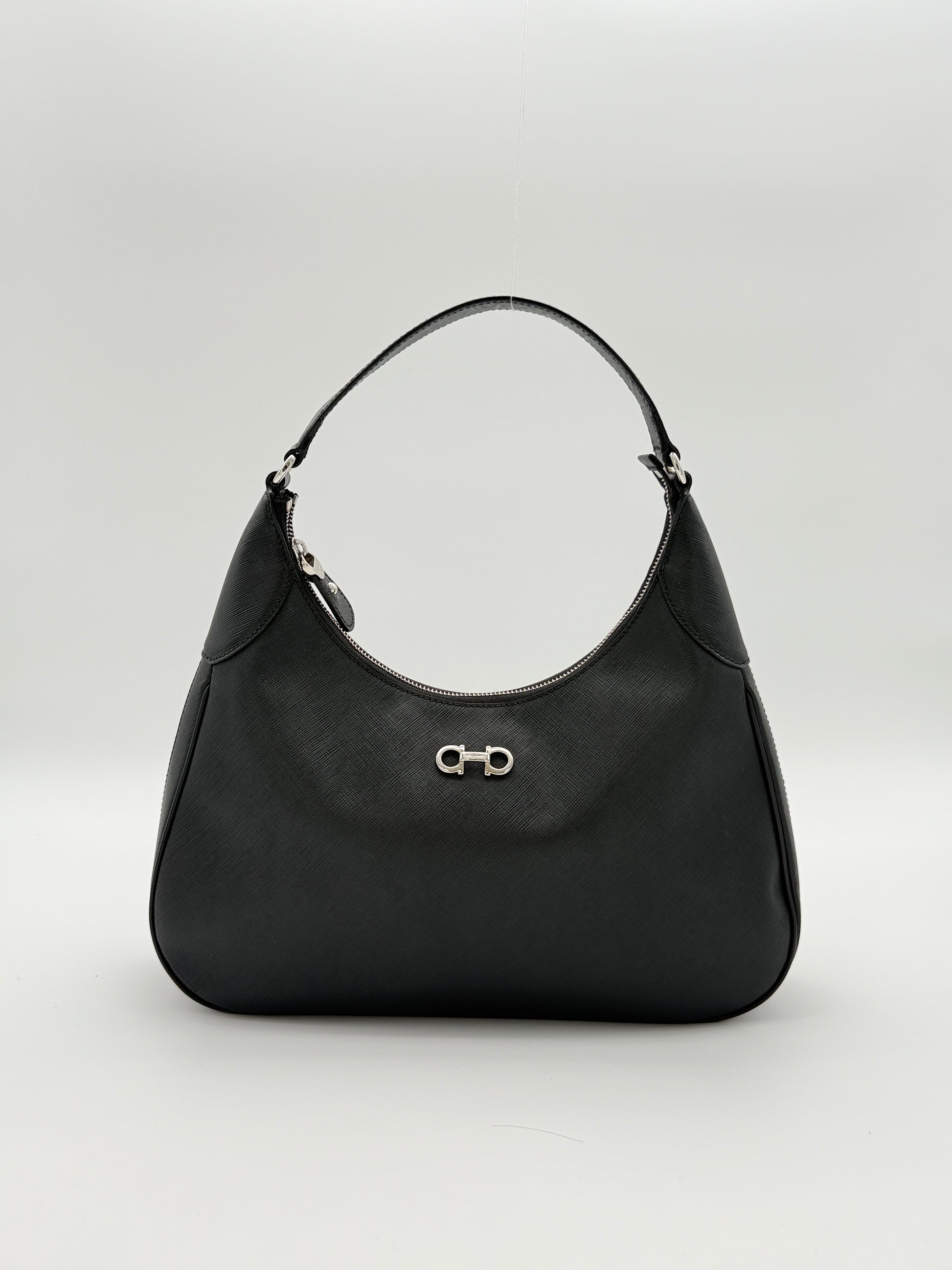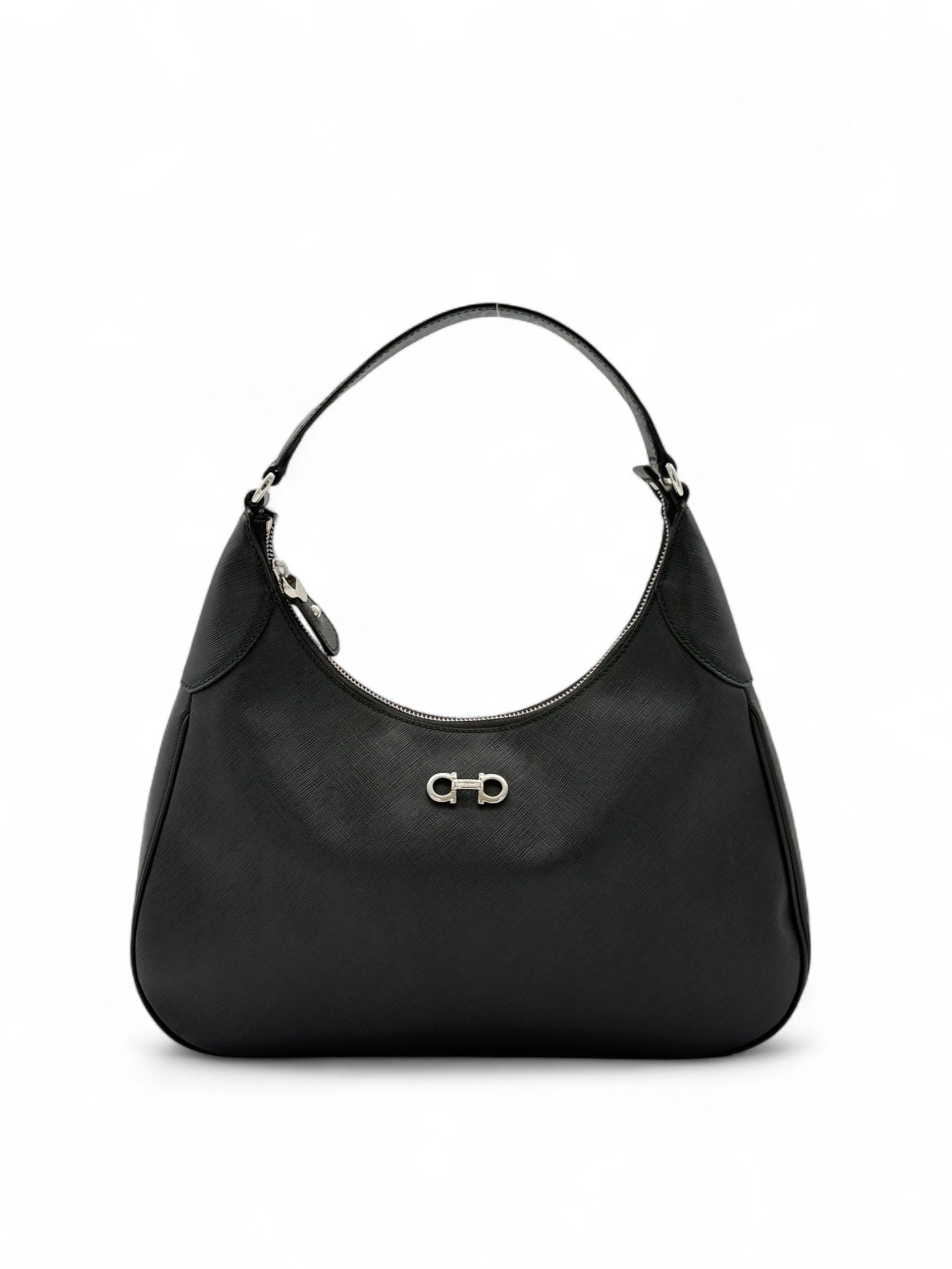 This black pebbled leather hobo from Salvatore Ferragamo is simple, elegant, and endlessly wearable. Finished with silver tone Gancini hardware, it has a soft structured shape that makes it easy to wear every day. this is the kind of bag that works for any look.