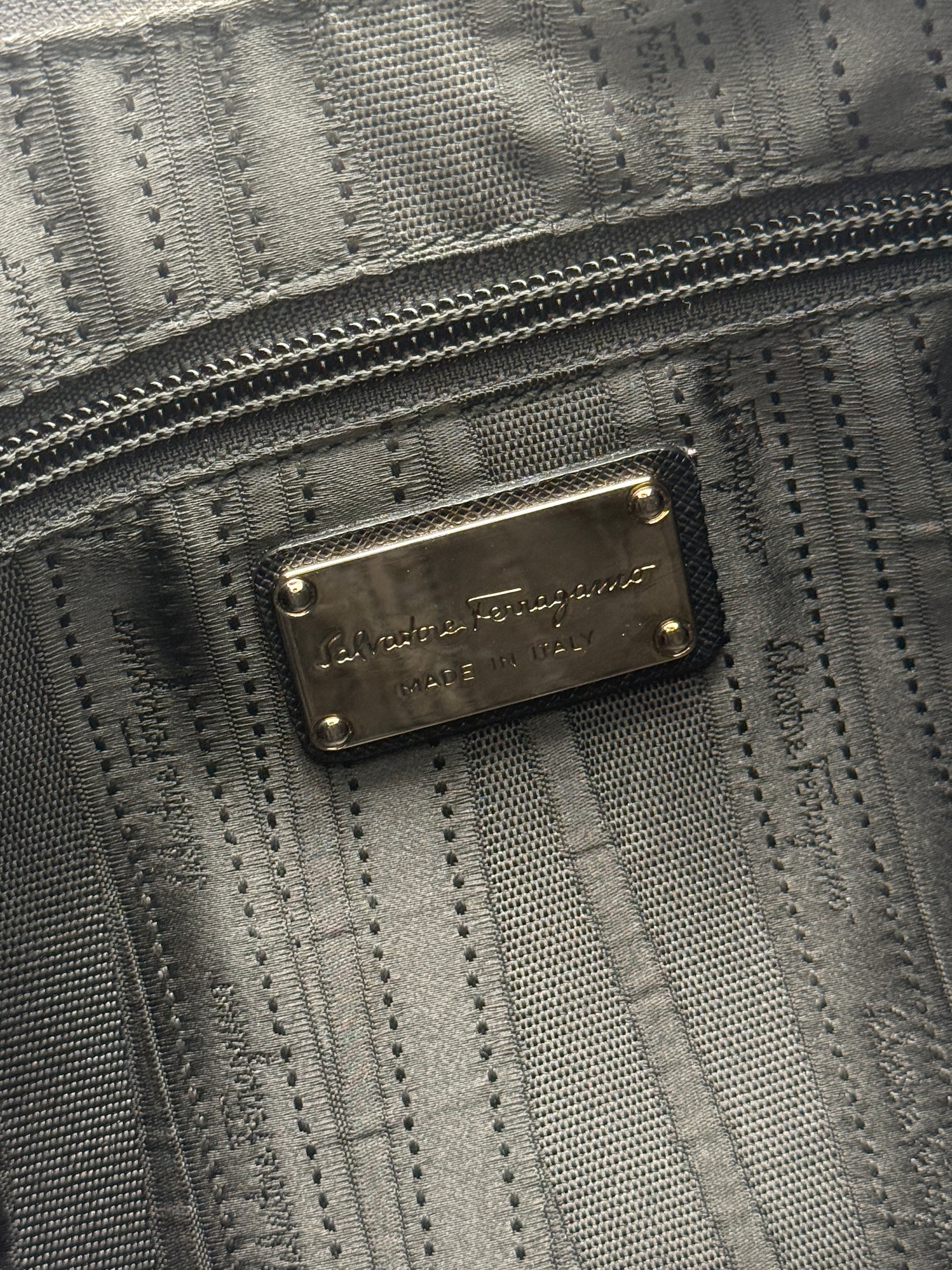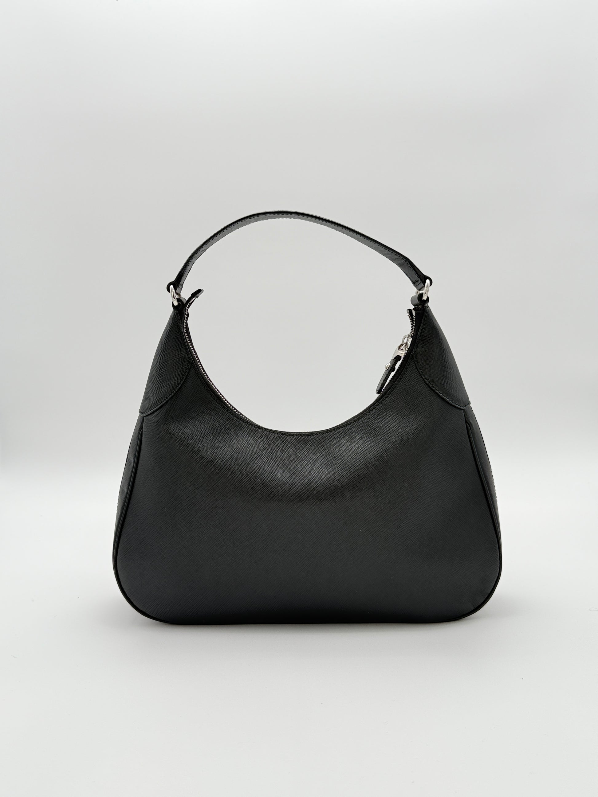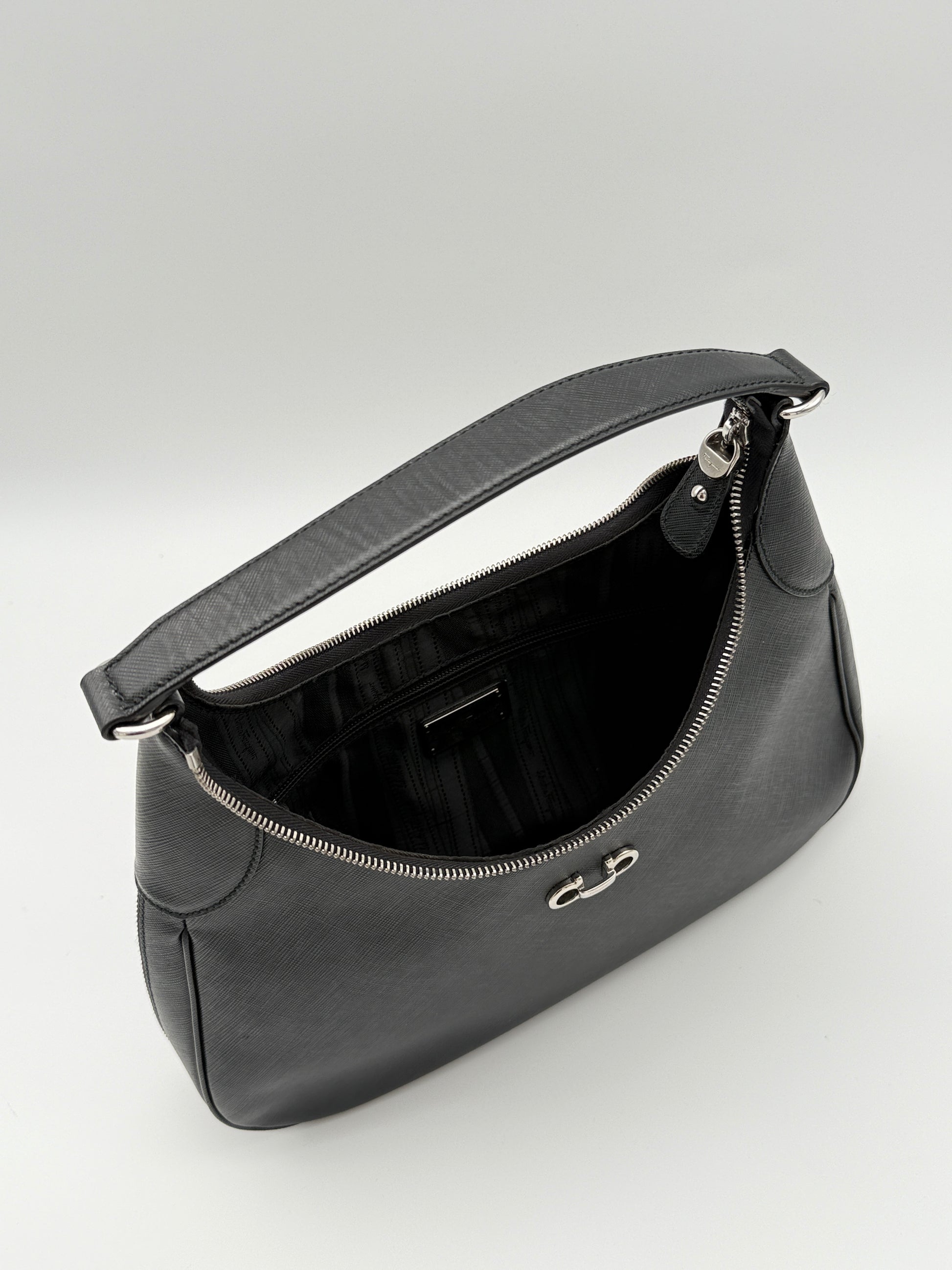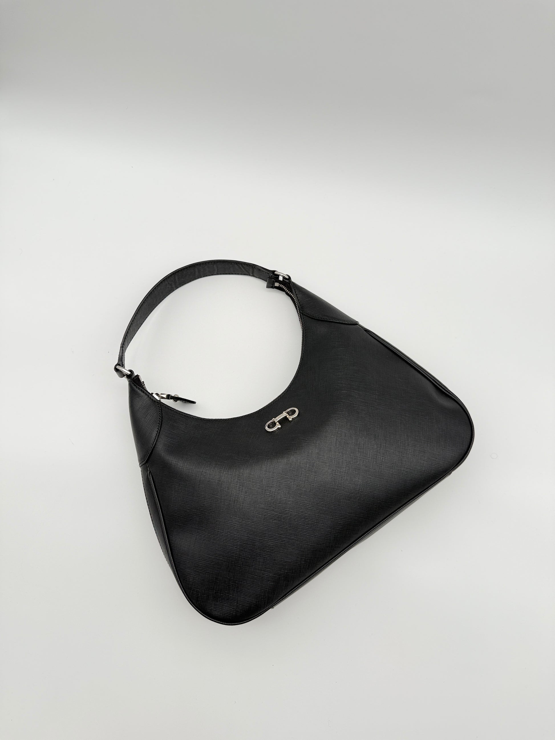 This black pebbled leather hobo from Salvatore Ferragamo is simple, elegant, and endlessly wearable. Finished with silver tone Gancini hardware, it has a soft structured shape that makes it easy to wear every day. this is the kind of bag that works for any look.