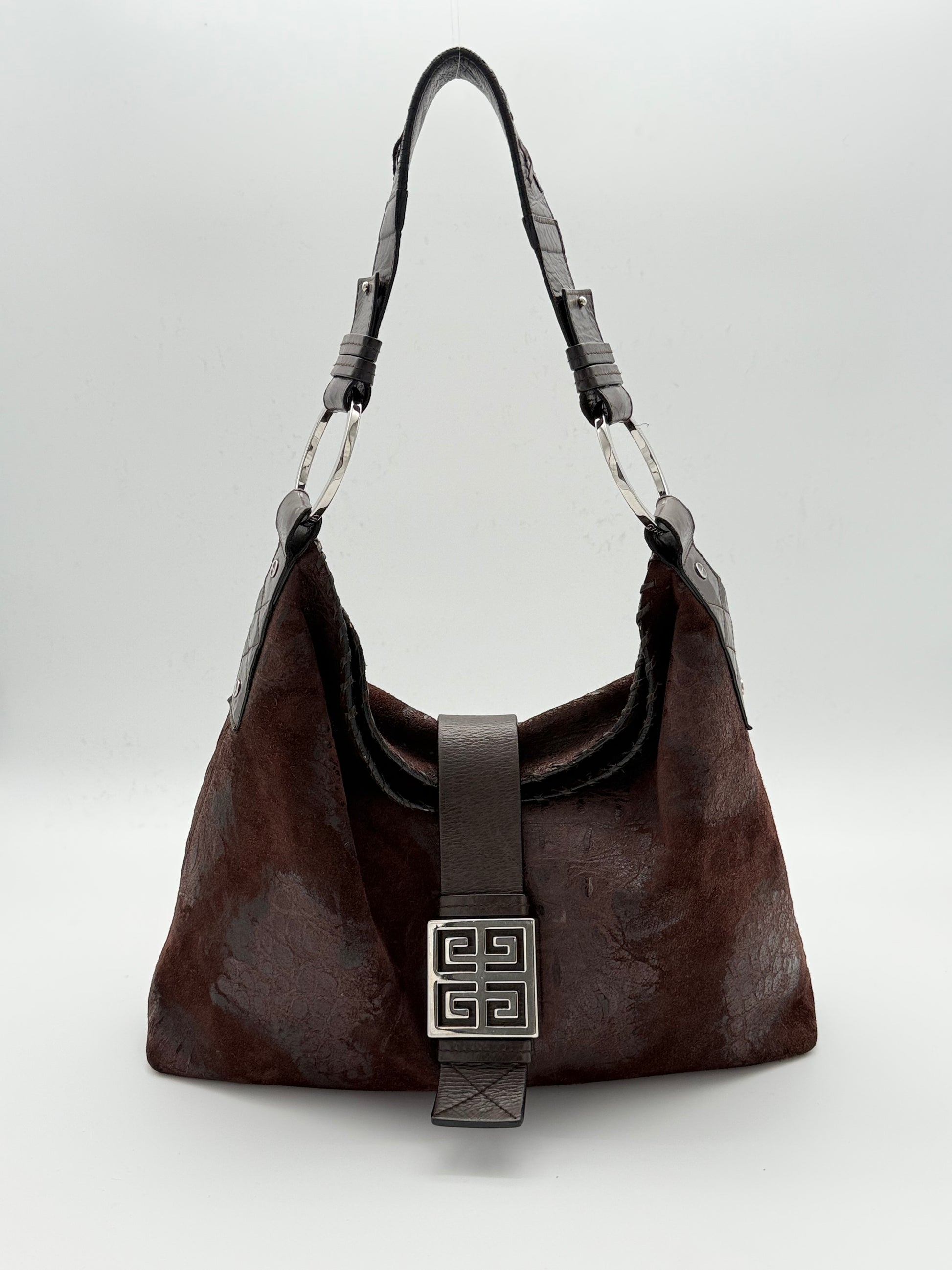 Crafted in rich burgundy suede with glossy leather patches subtly embossed in a reptile-like texture. This Givenchy shoulder bag features a structured silhouette, silver-tone ring hardware and a wide leather strap with a bold logo buckle at the front.