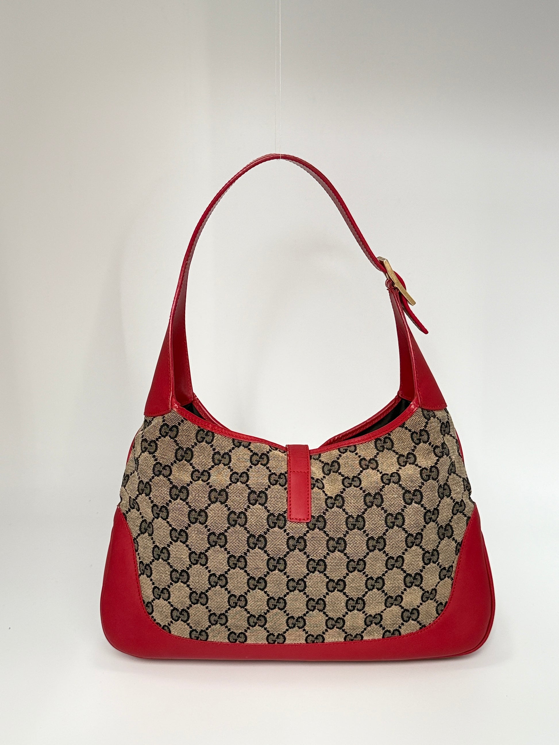 A standout piece from the house of Gucci, this vintage Jackie reimagines the iconic silhouette in striking red leather and beige GG monogram canvas. The bold contrast highlights the elegance of its proportions, while the signature piston clasp in brushed gold-tone hardware brings a sense of quiet power to the design.