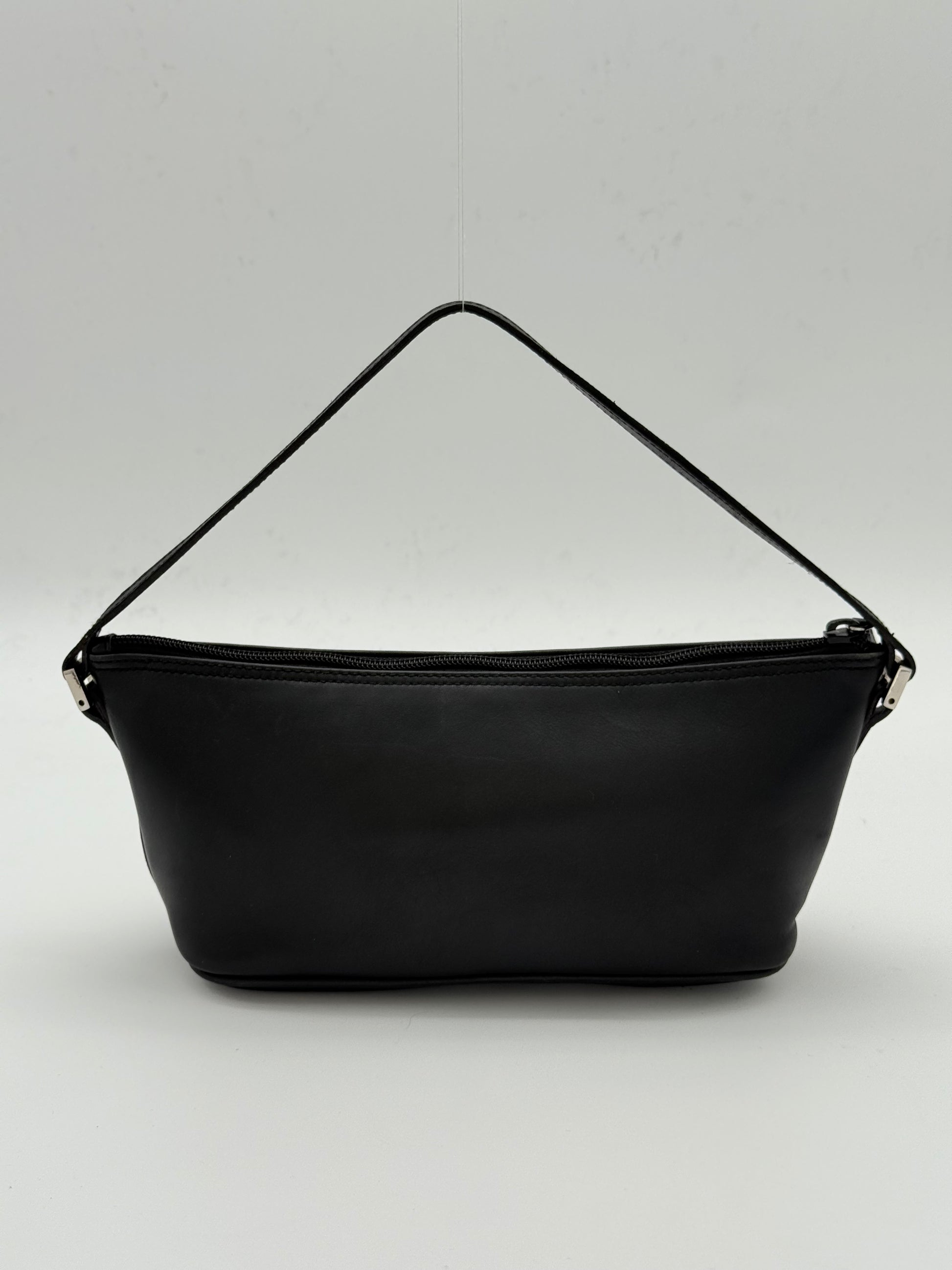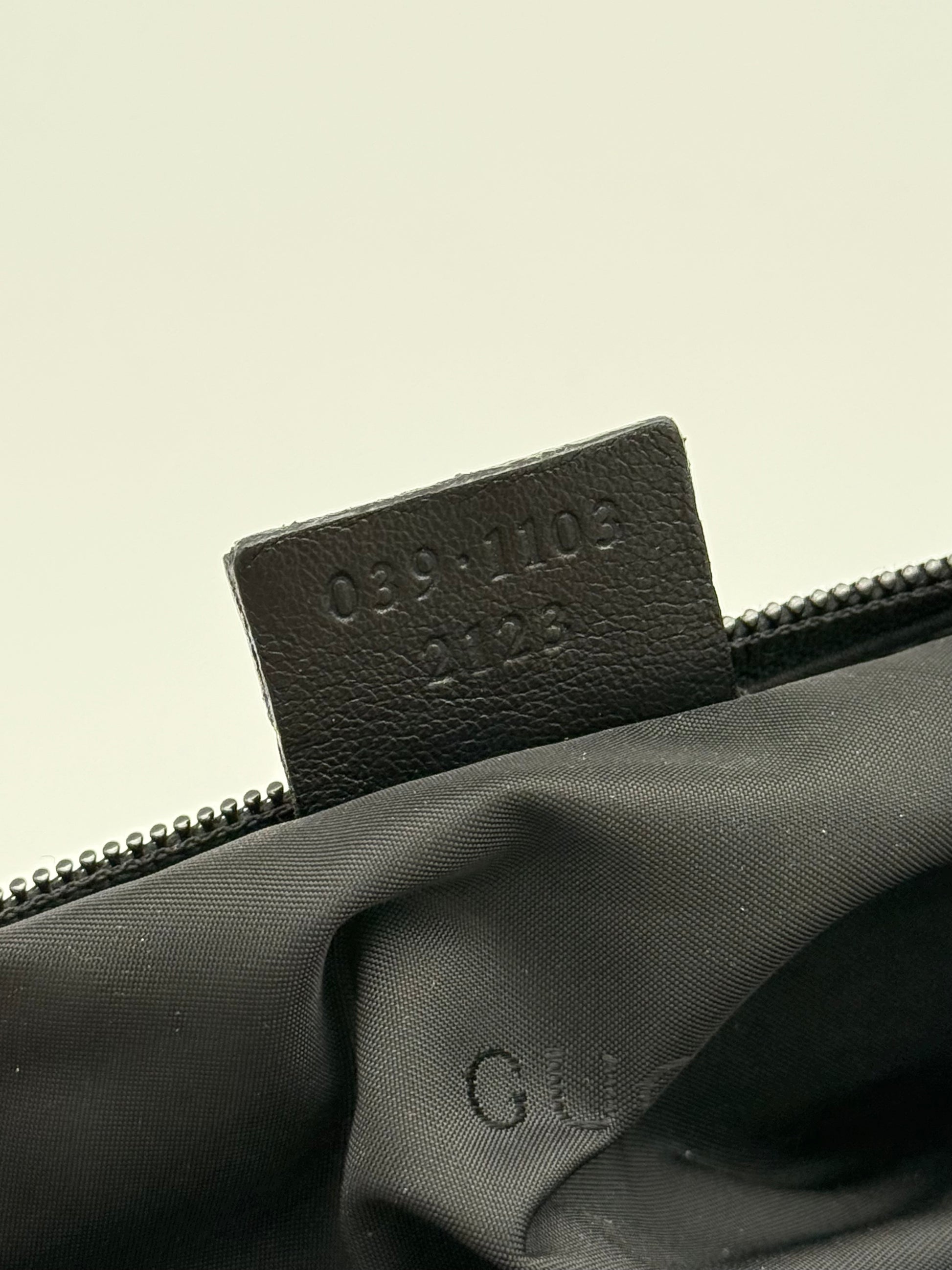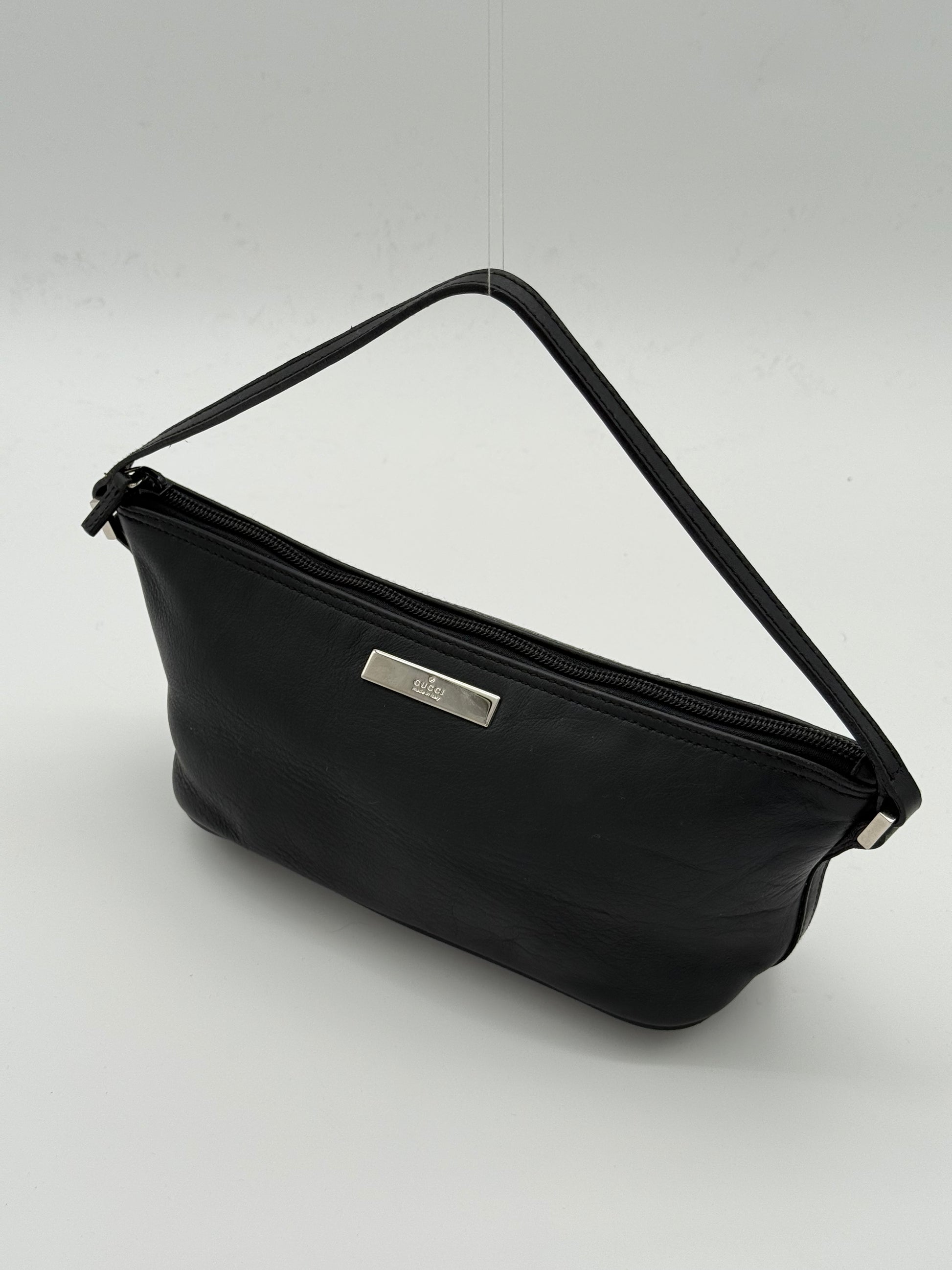 Crafted in black leather with silver-tone hardware, this rare Gucci mini bag features a curved silhouette, zip closure and a clean logo plaque at the front. The minimalist design is balanced with beautiful detailing, from the tapered edges to the subtle structure that keeps its shape. The interior is fully lined in black Gucci-logo jacquard fabric and includes one zip pocket.