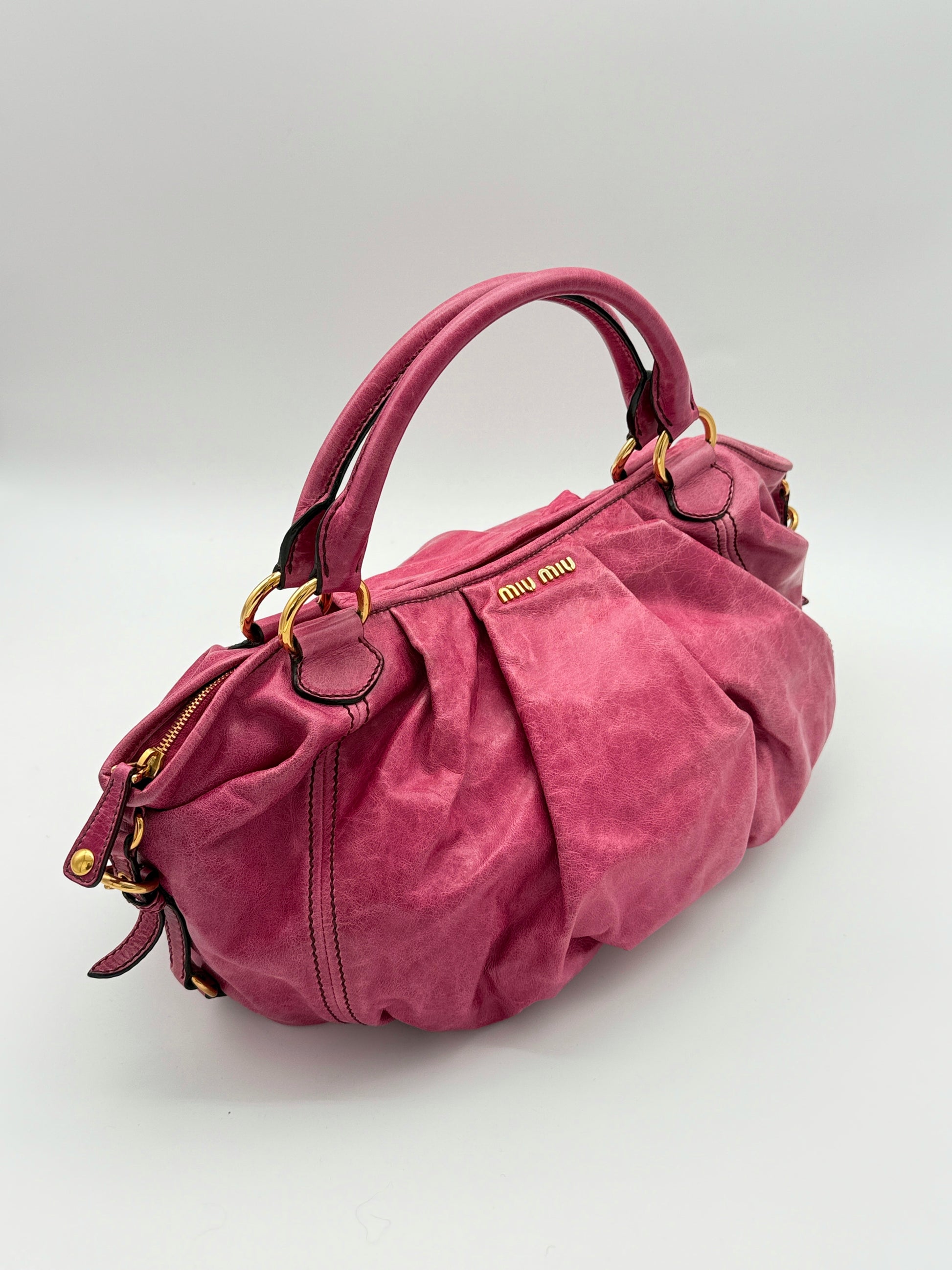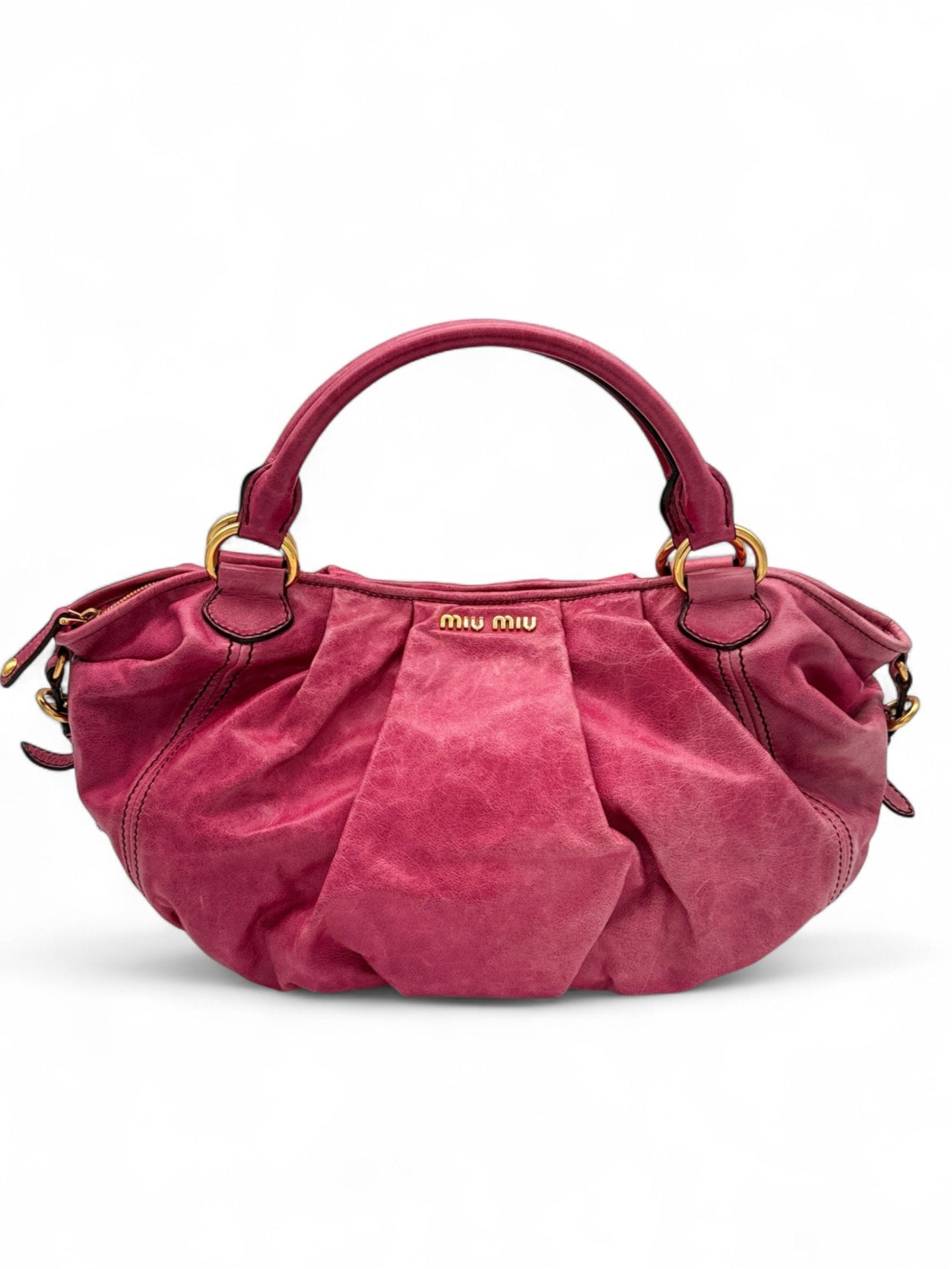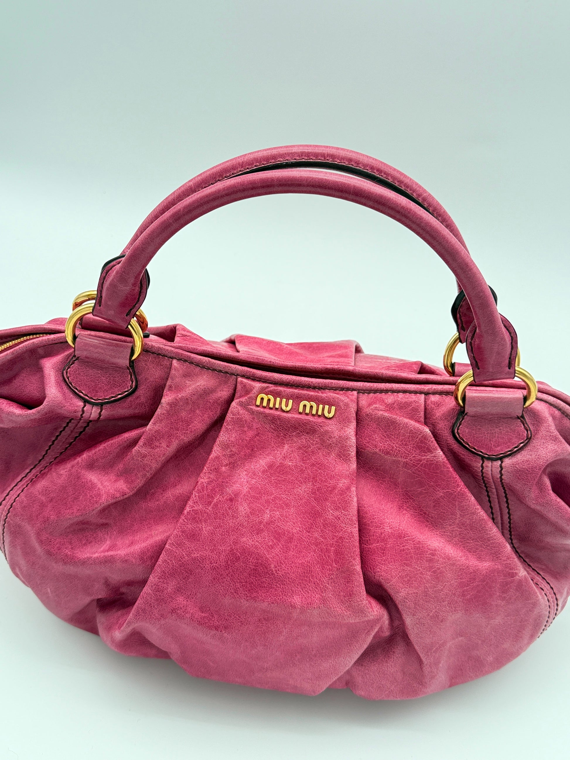 A rare vintage piece from Miu Miu, crafted in soft pleated leather in a rich pink hue with gold-tone hardware and curved handles. The gentle fading is part of the original design, adding softness and character to the bag. A unique piece that brings charm and elegance to any look.