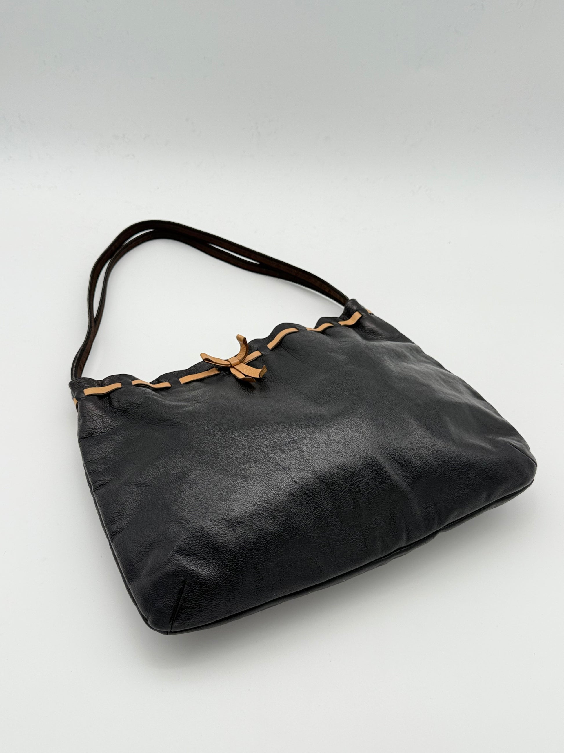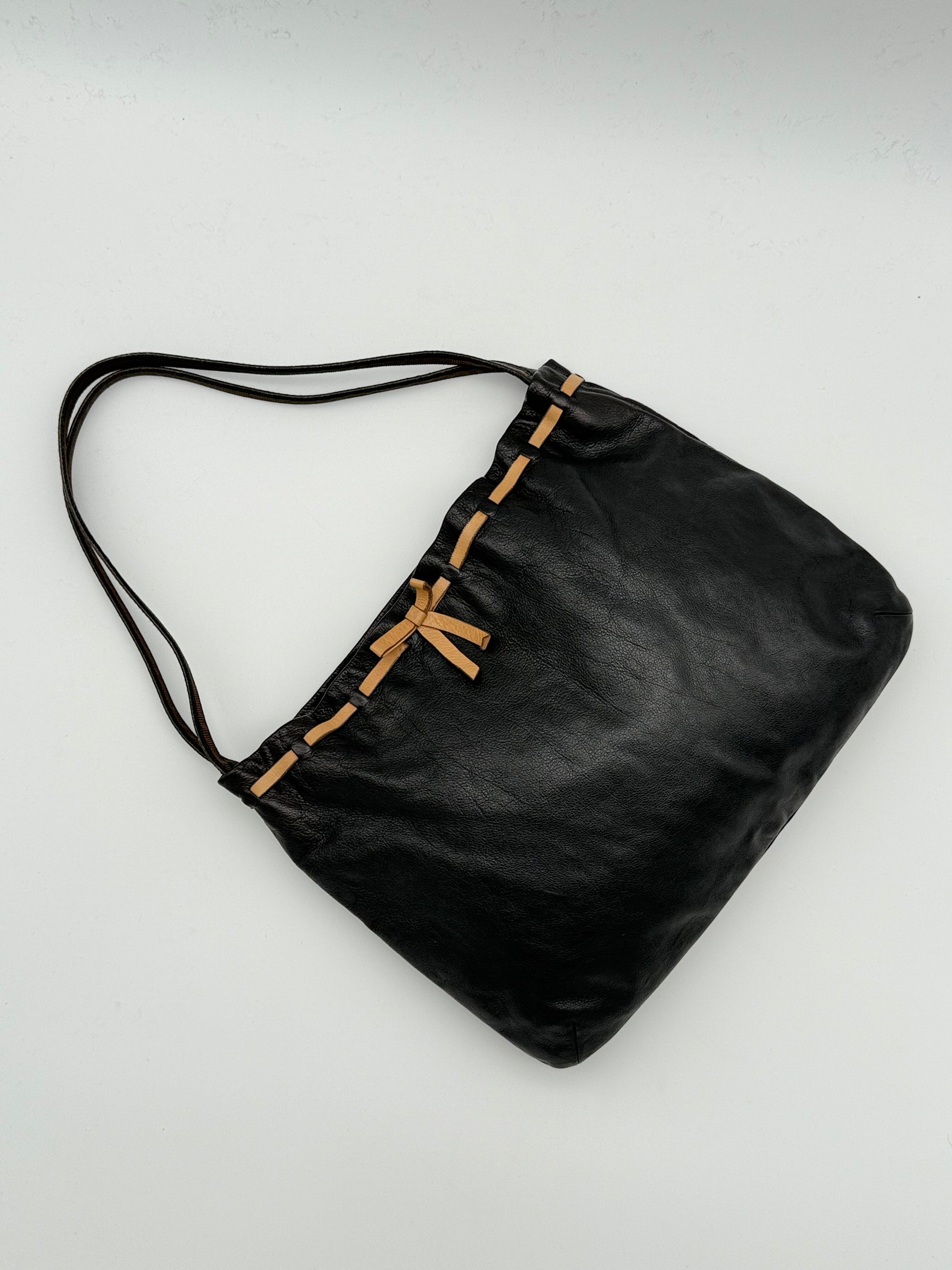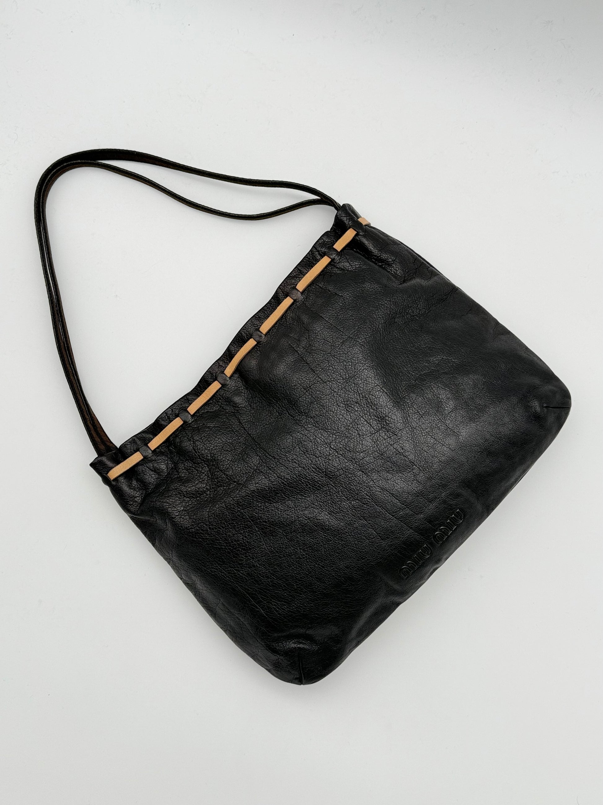 This vintage Miu Miu shoulder bag features a delicate ribbon threading through the top, double shoulder straps and a clean minimal silhouette.