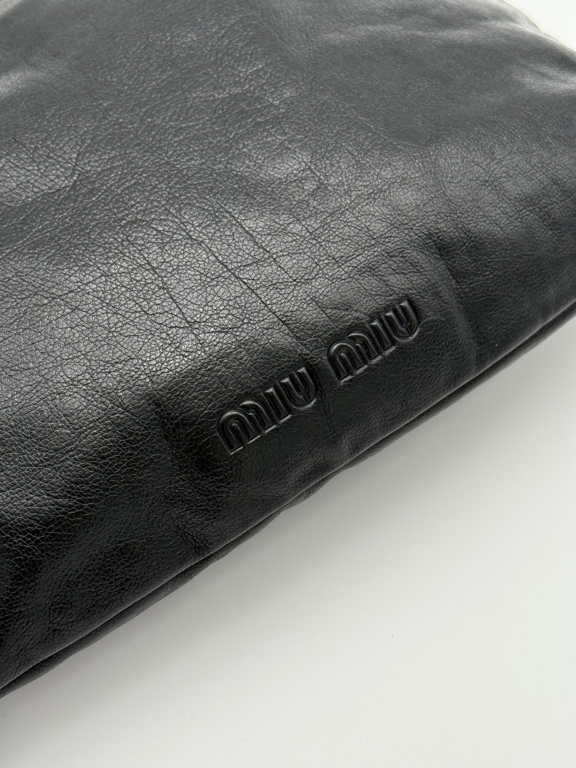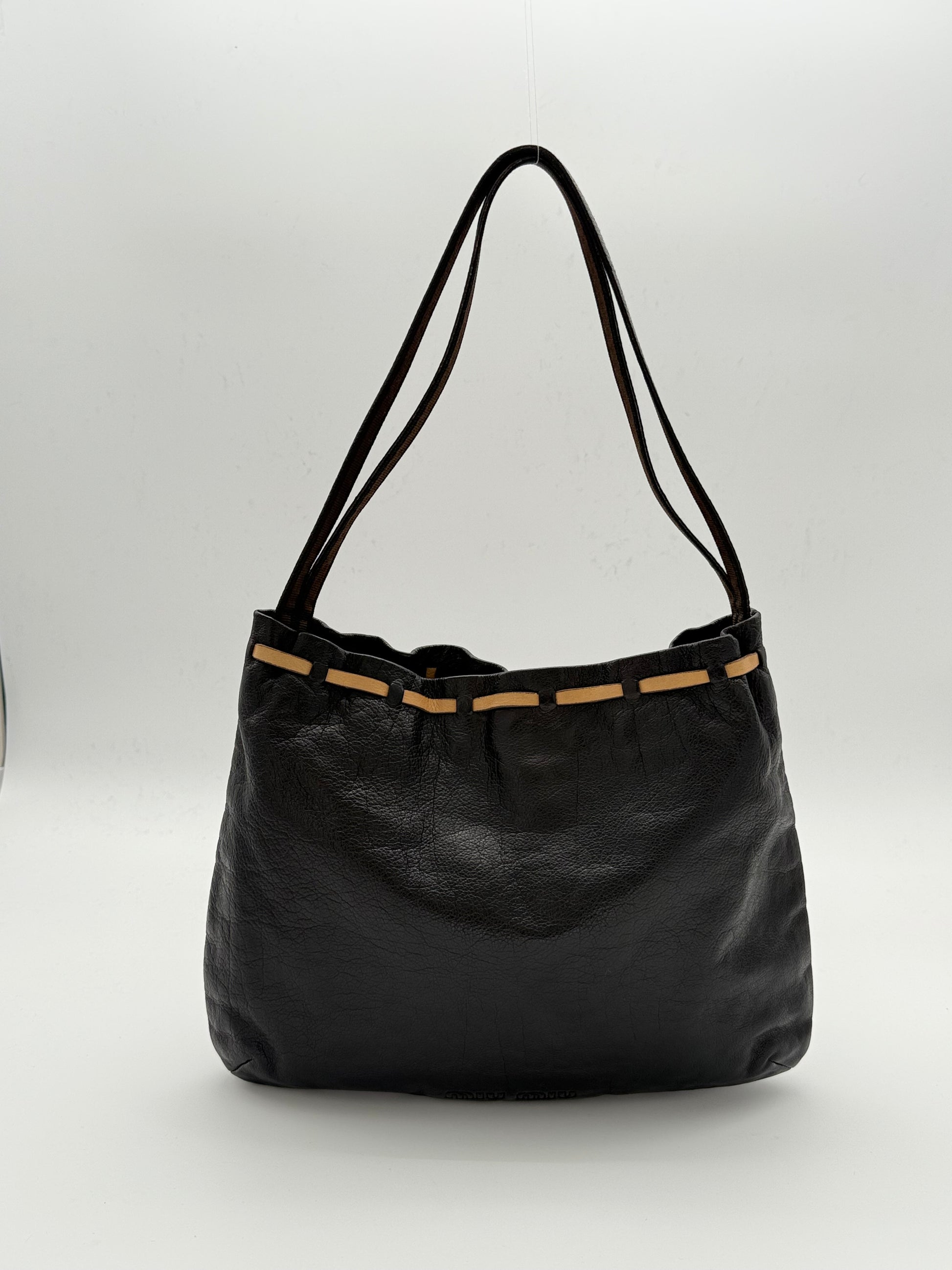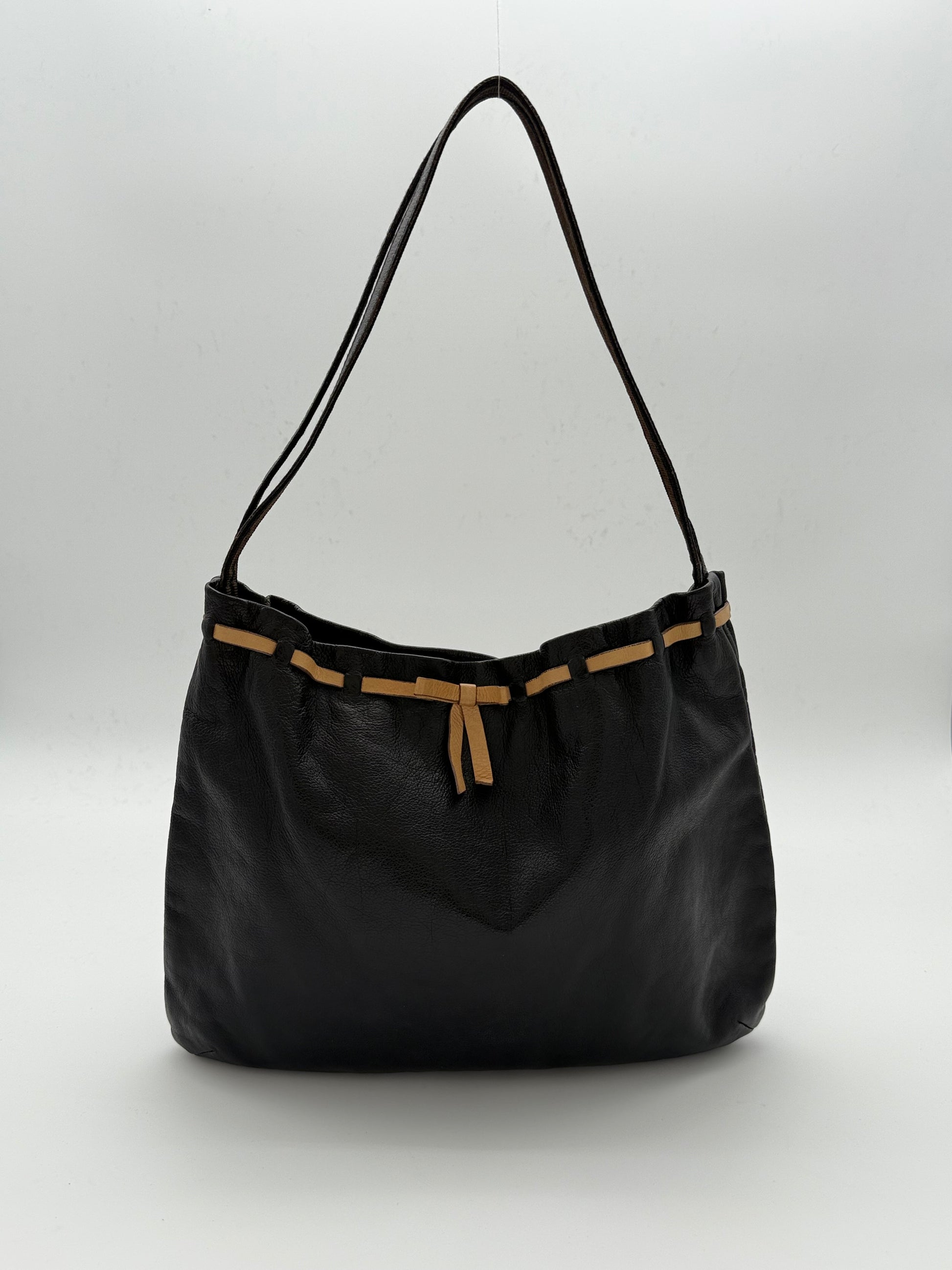 This vintage Miu Miu shoulder bag features a delicate ribbon threading through the top, double shoulder straps and a clean minimal silhouette.