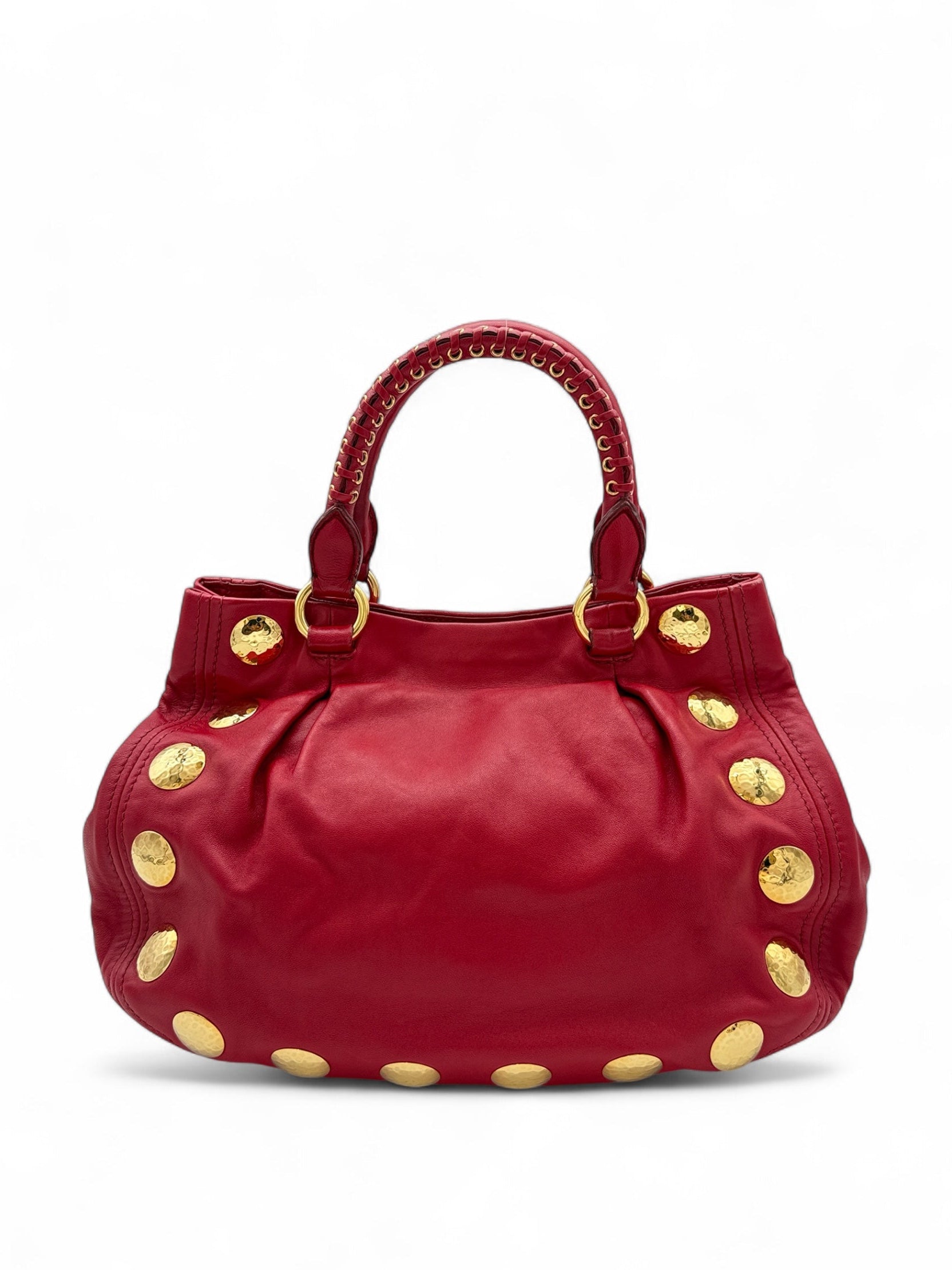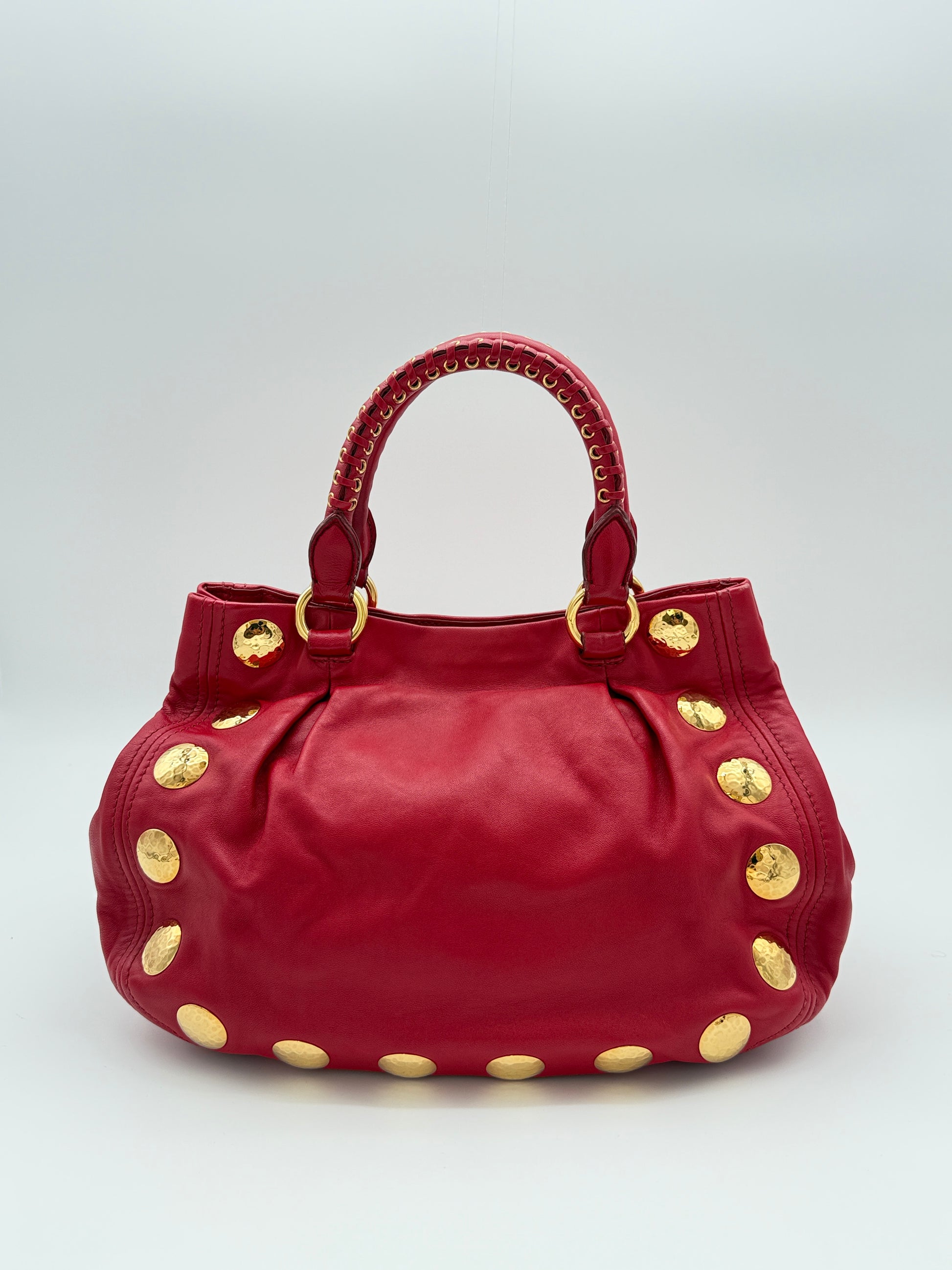 Rare Miu Miu Crafted in soft lambskin leather and finished with hammered gold tone studs, this Miu Miu bag features dual top handles with eyelet details and a slouchy structured shape. Striking but easy to style; perfect for dressing up a casual outfit or adding a bold touch to evening wear.