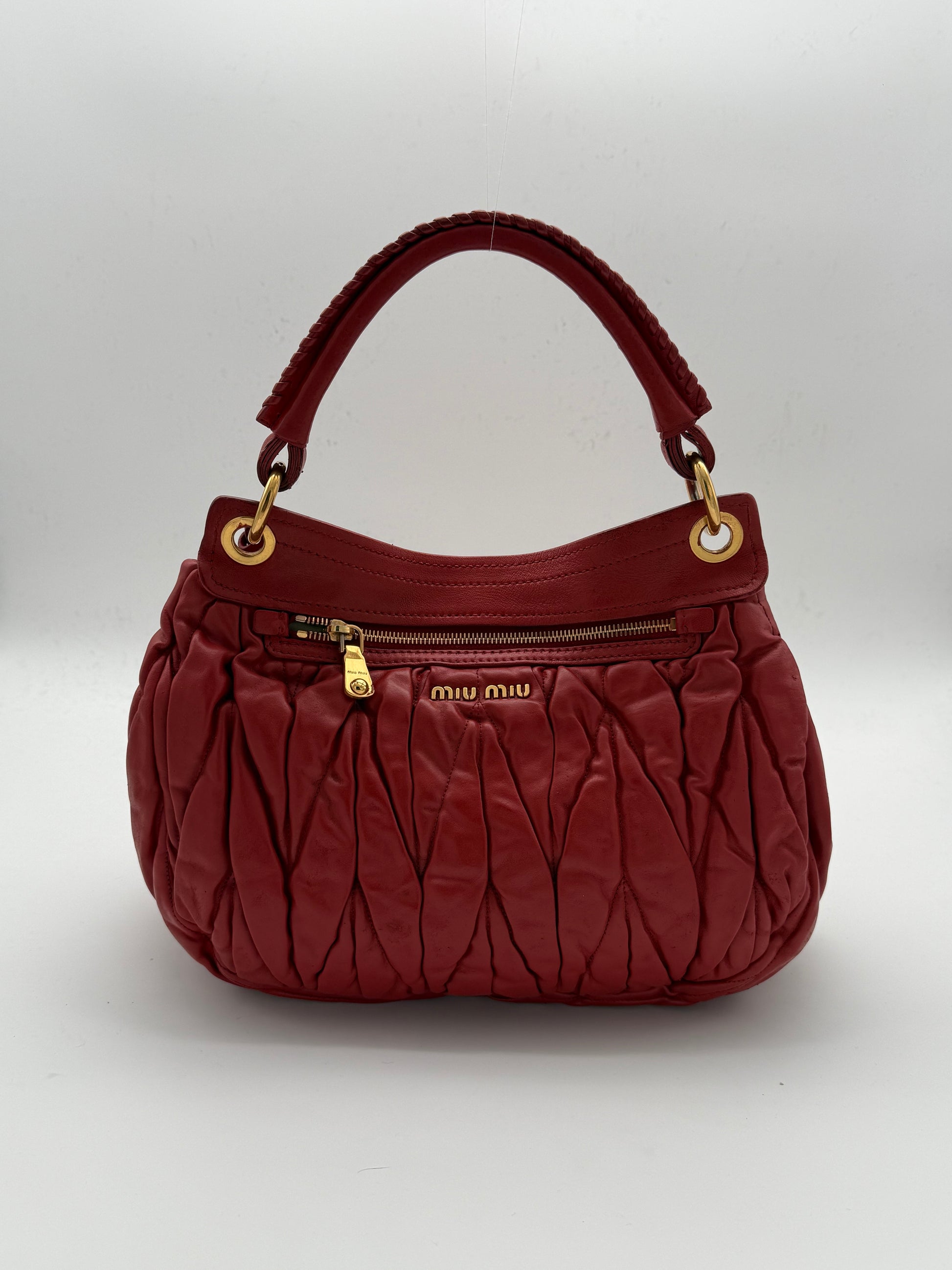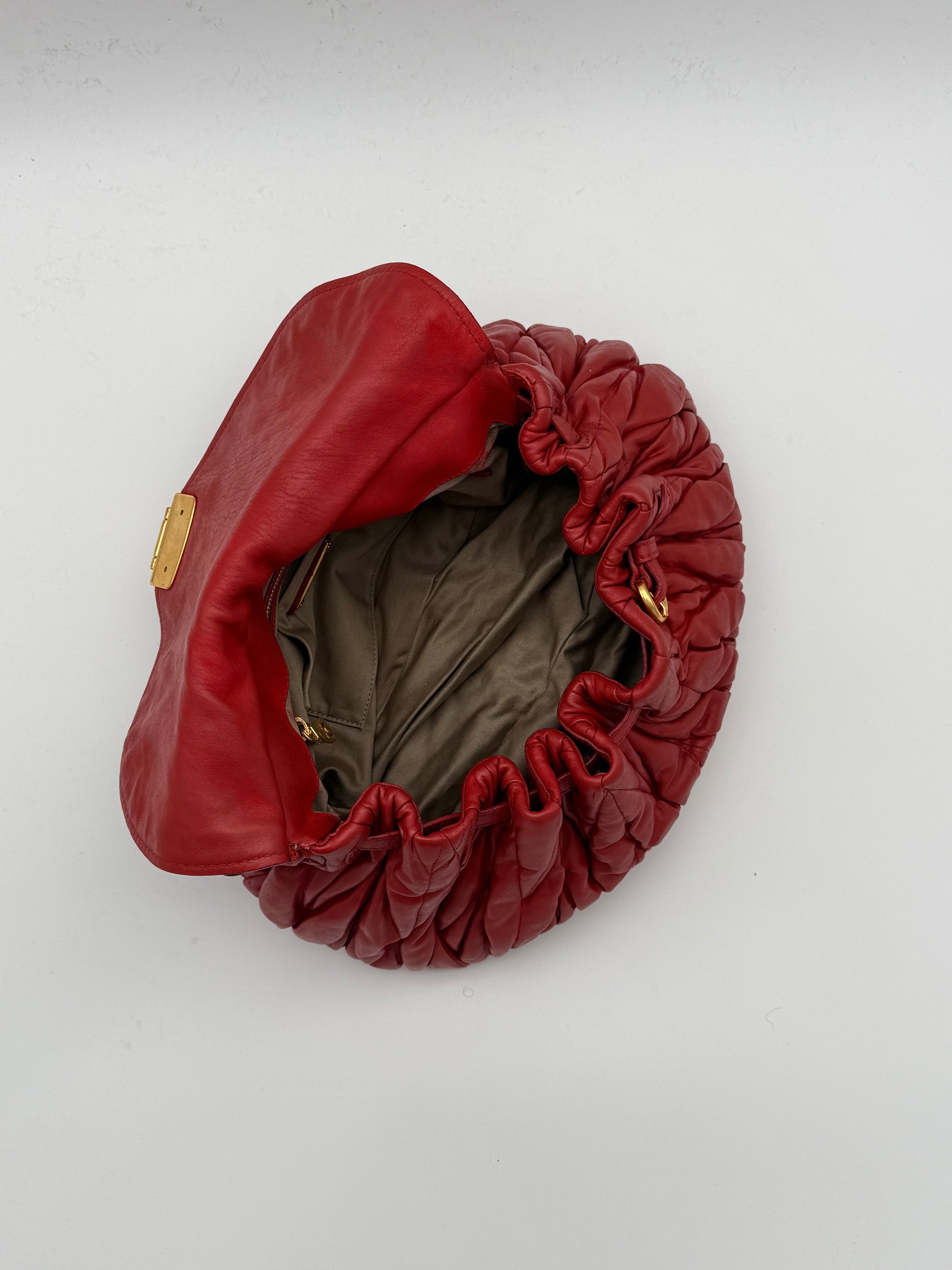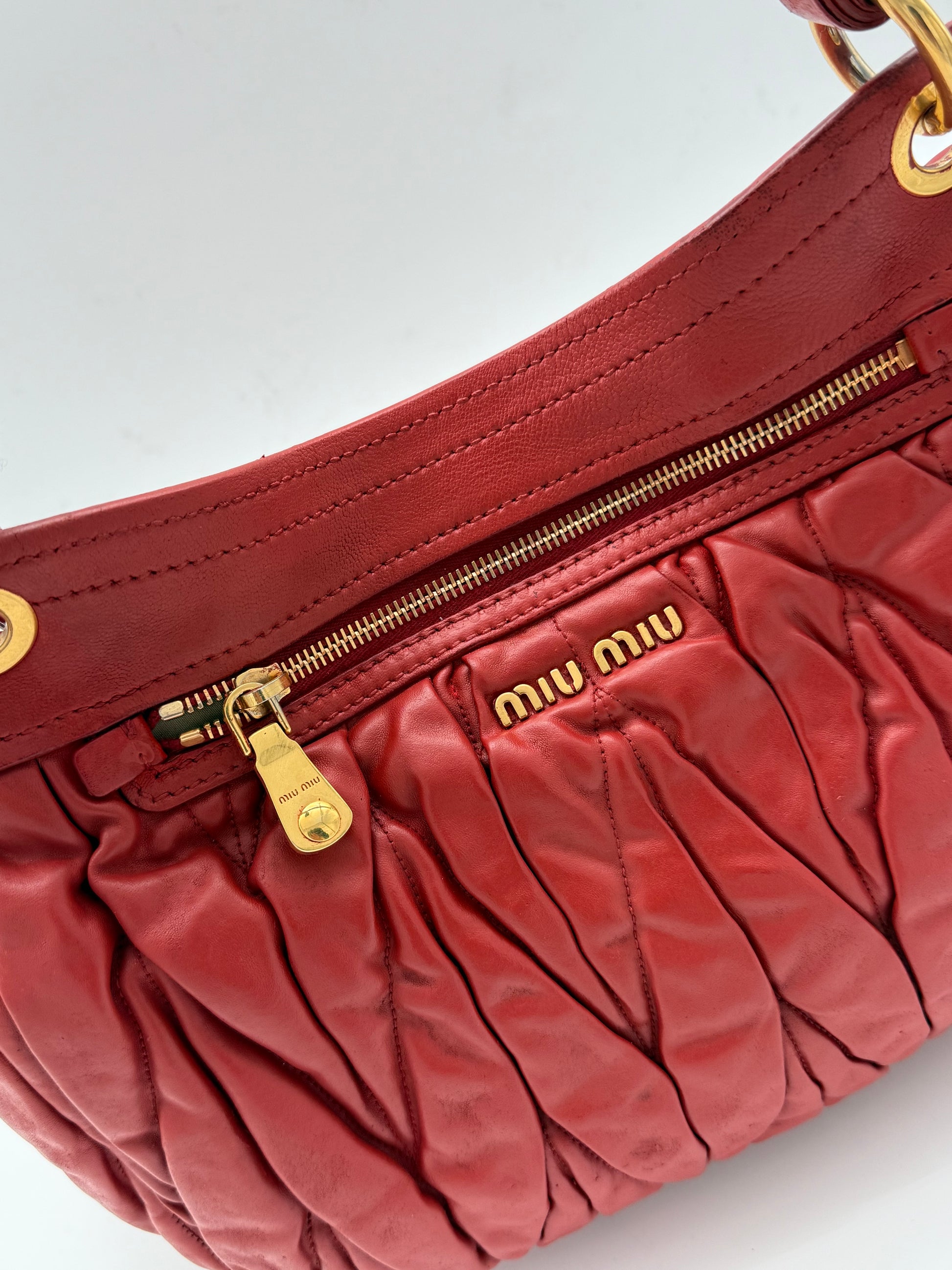 Crafted in supple matelassé leather. This Miu Miu shoulder bag is defined by its sculptural pleating and signature gold lock closure. The vibrant red tone enhances the texture, giving the piece a bold yet timeless presence.