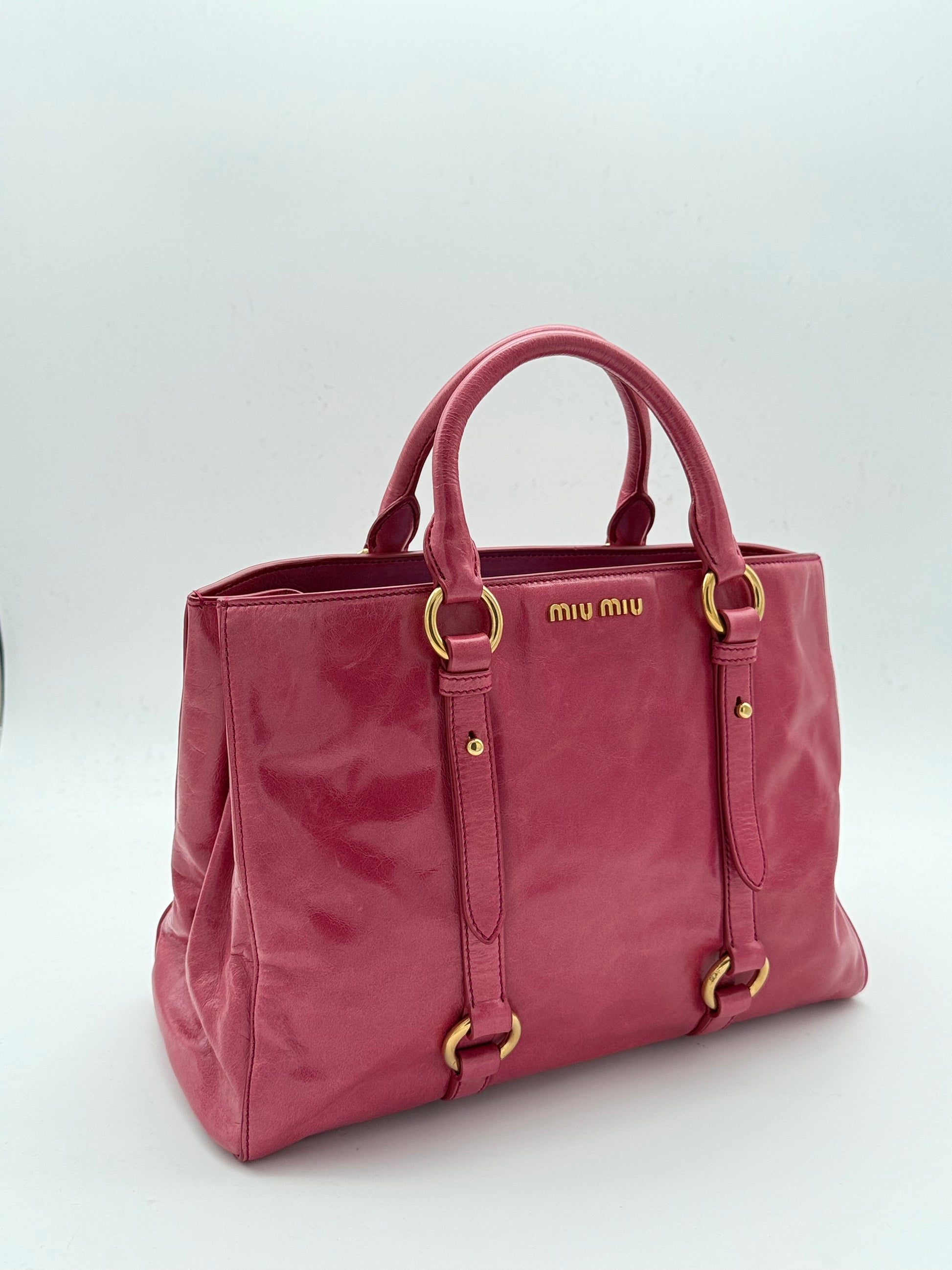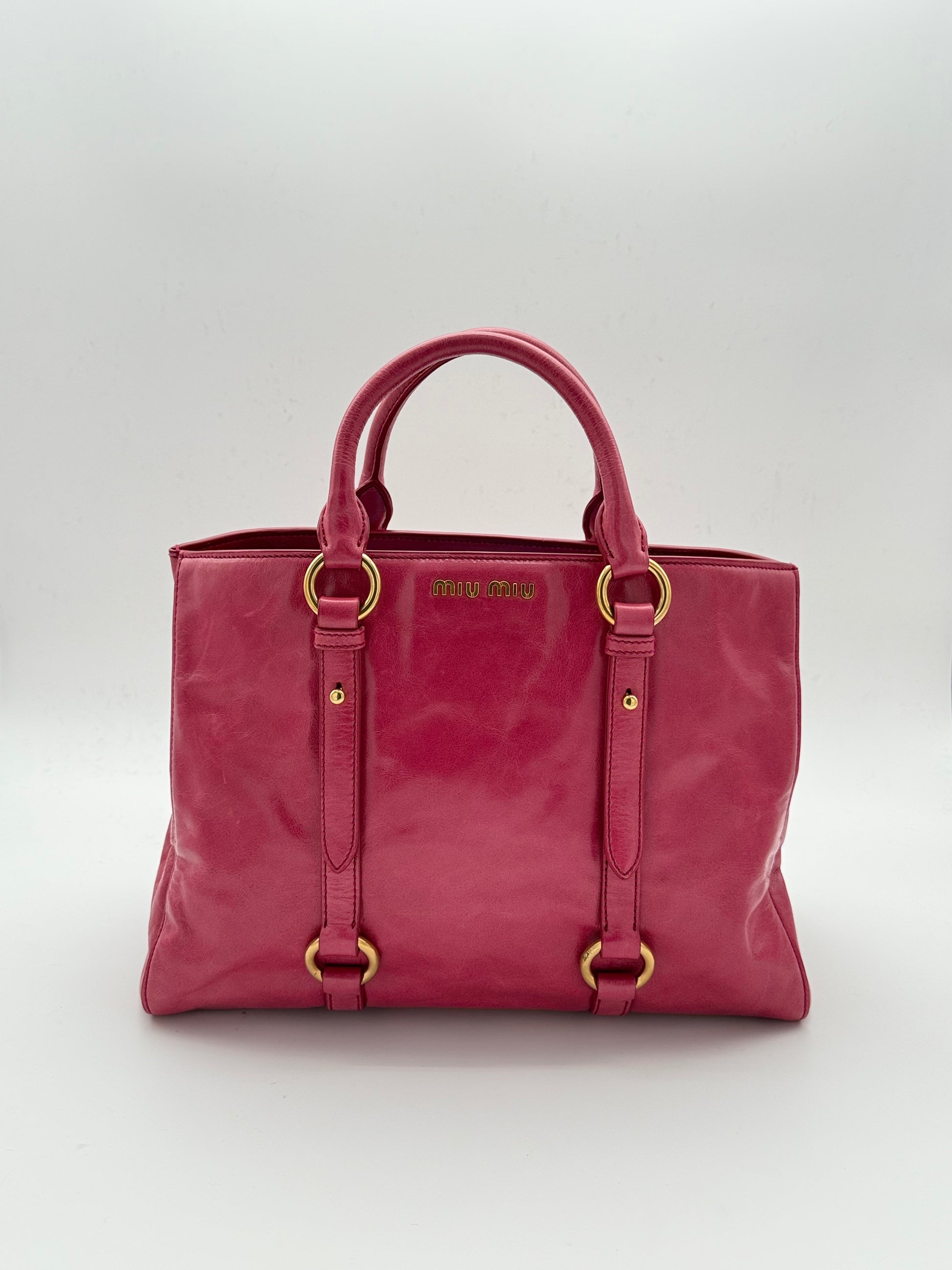 Crafted in glossy peonia pink lambskin leather, this Miu Miu tote features a structured rectangular silhouette accented with adjustable strap details and gold-tone hardware. The bold hue is softened by rounded top handles and a tonal satin-lined interior, combining femininity and function in a refined statement piece. A central zip compartment divides two open sections, making it ideal for everyday organization with an elegant edge.
