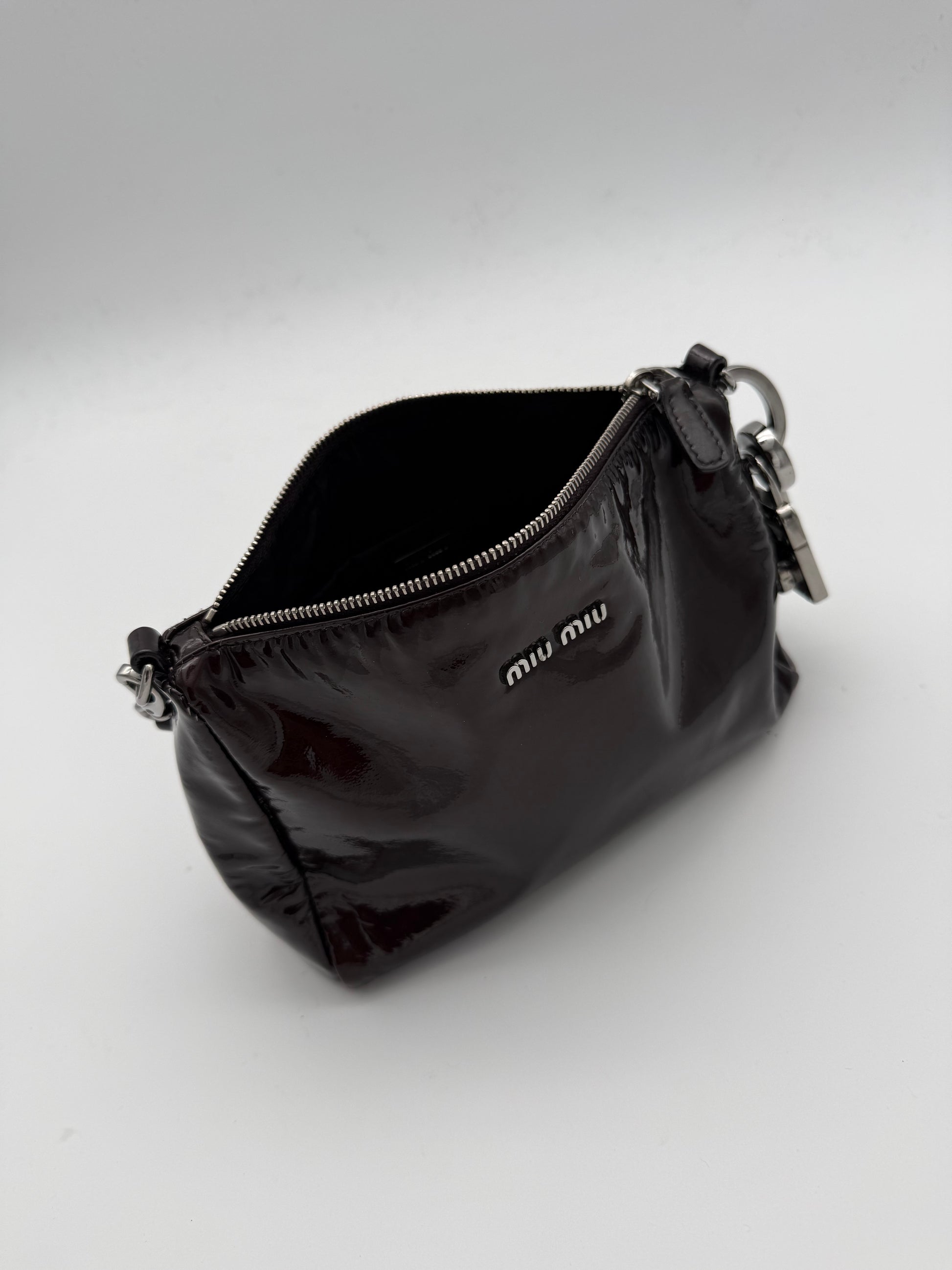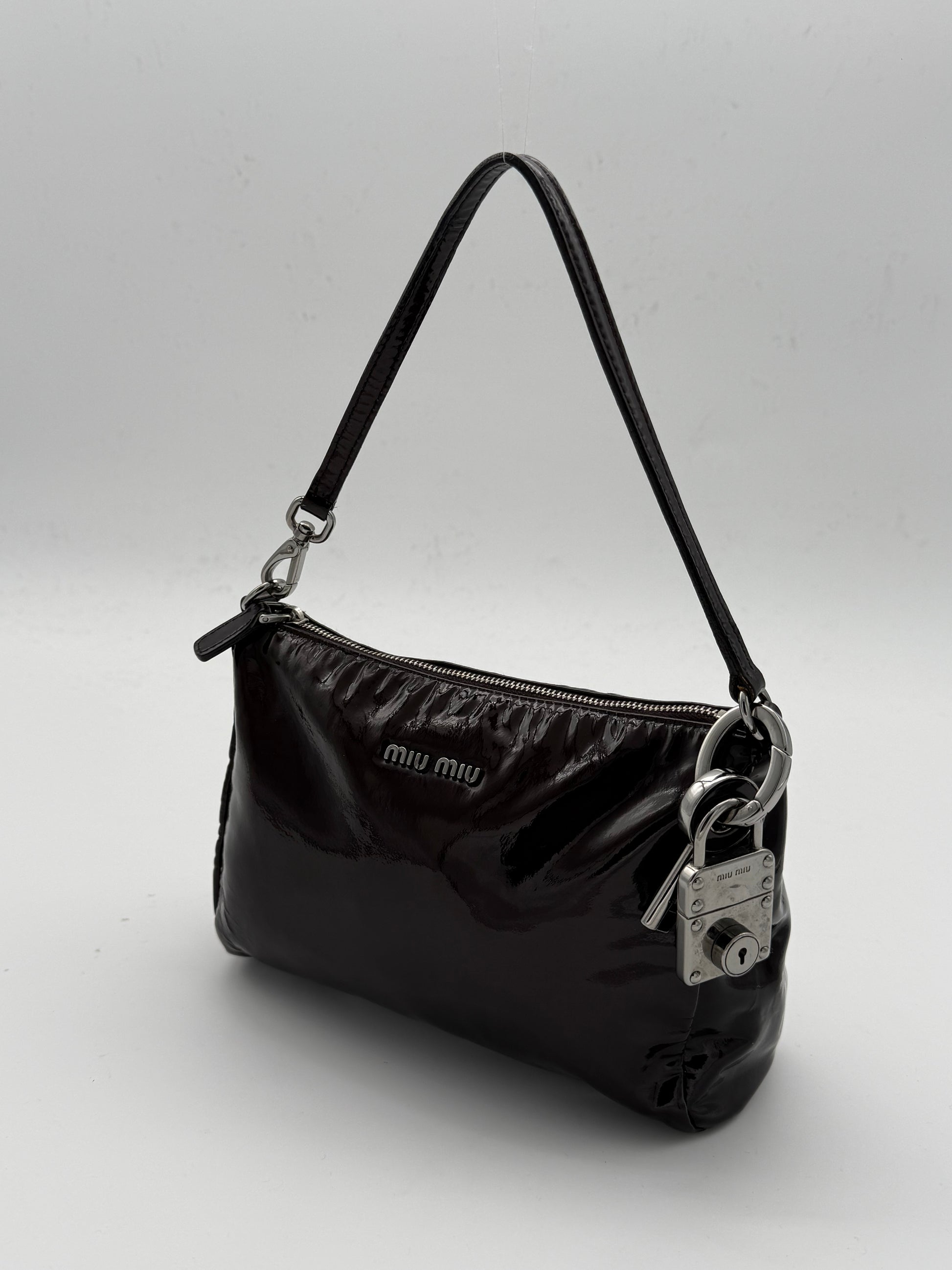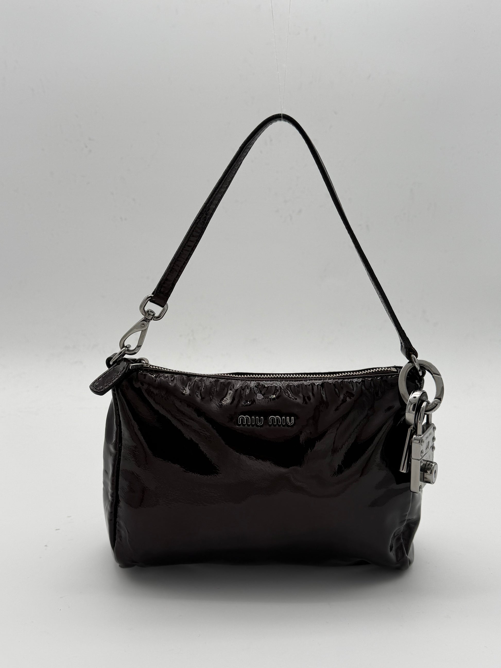 Crafted in burgundy patent leather with silver-tone hardware. This Miu Miu bag stands out with its sleek silhouette, glossy finish and signature lock and key charm detail.